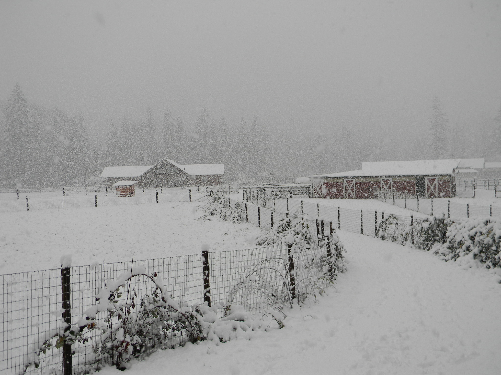 In my new life up here in Oregon, the natural world and its cycles are much more evident and closely felt. In this month of December, the darkest month, the days have grown so short that sunset falls at 4:30 PM, and by 5:00 our farm is cloaked in darkness. Over the past two weeks, whenever we’ve had rain (a frequent occurrence in Oregon during the winter), the mountain tops around us have been dusted with snow. As the weather turned colder over the past week, we could see the snow line move lower down the mountains. We had flurries on Saturday, then beginning Sunday evening, a snowstorm of almost blizzard proportions blew for several days. It was exhilarating and beautiful.